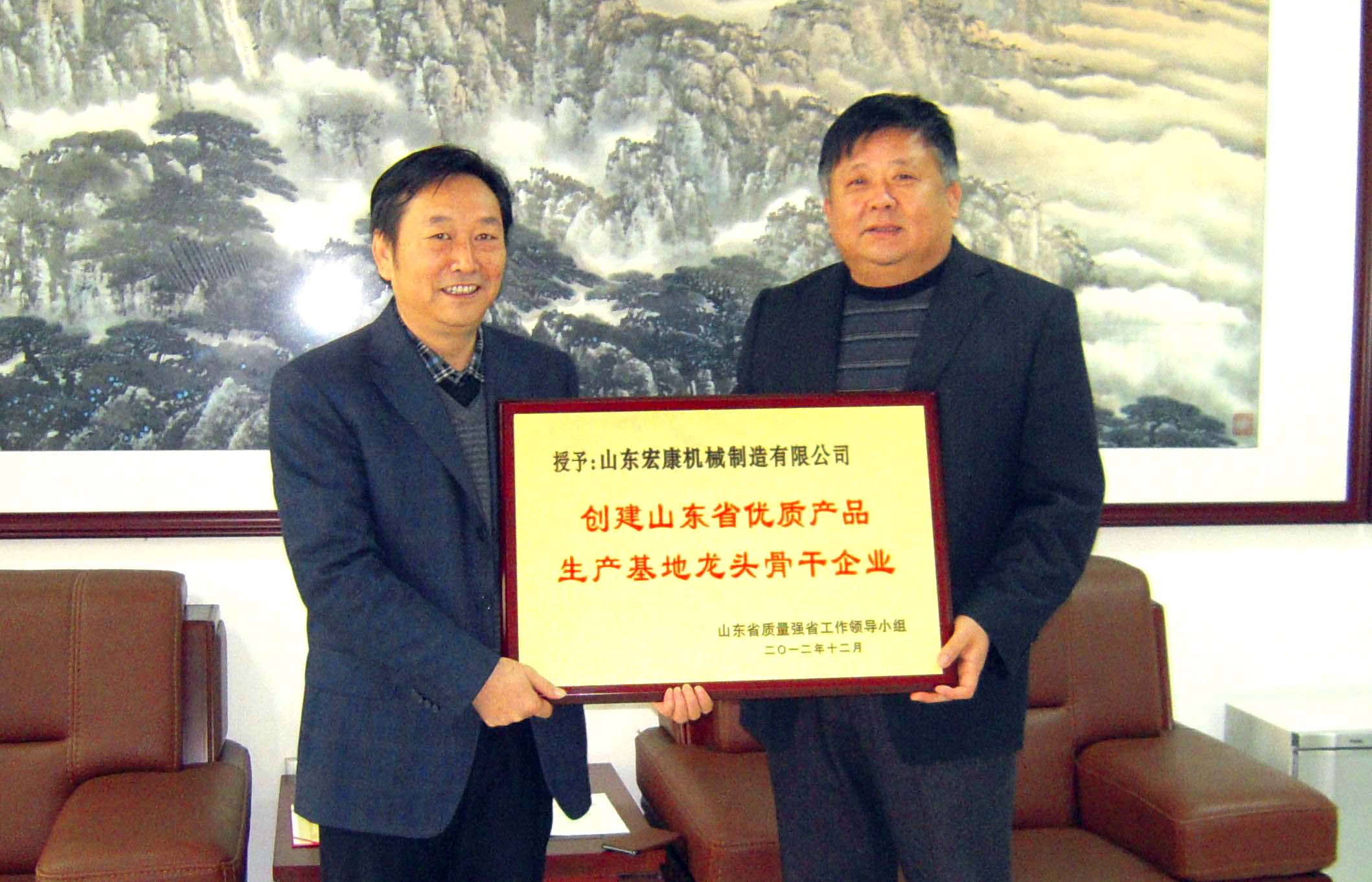 近日,山东省质量兴省领导小组下发鲁质强发【2012】2号文件《关于表彰2012年创建山东省优质产品生产基地及龙头骨干企业的通知》,宏康榜上有名,喜获2012年“创建山东省优质产品生产基地龙头骨干企业”荣誉称号。图为1月30日岱岳区质监局局长张复田向集团董事长、总经理康凤明颁发荣誉牌匾。